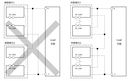 相比之下,將已經(jīng)并聯(lián)連接的TDK-Lambda電源單元進(jìn)行串聯(lián)是可行的。因?yàn)椴⒙?lián)連接的電源單元電壓相同,將它們串聯(lián)起來(lái)不會(huì)引發(fā)上述問(wèn)題。但即便如此,也需要注意以下幾點(diǎn):